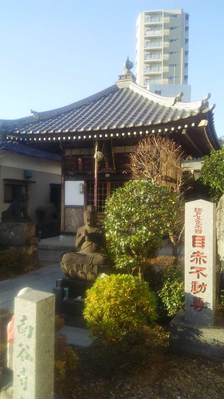 東京メトロ本駒込駅からすぐのところに、本郷通りむかって入り口がある。門柱に左に「赤目不動尊」、右に「大聖山 南谷寺」と彫られている。阿弥陀様が祀られている正面の本堂は扉が閉まっていたが、右手の不動堂にはお参りができた。