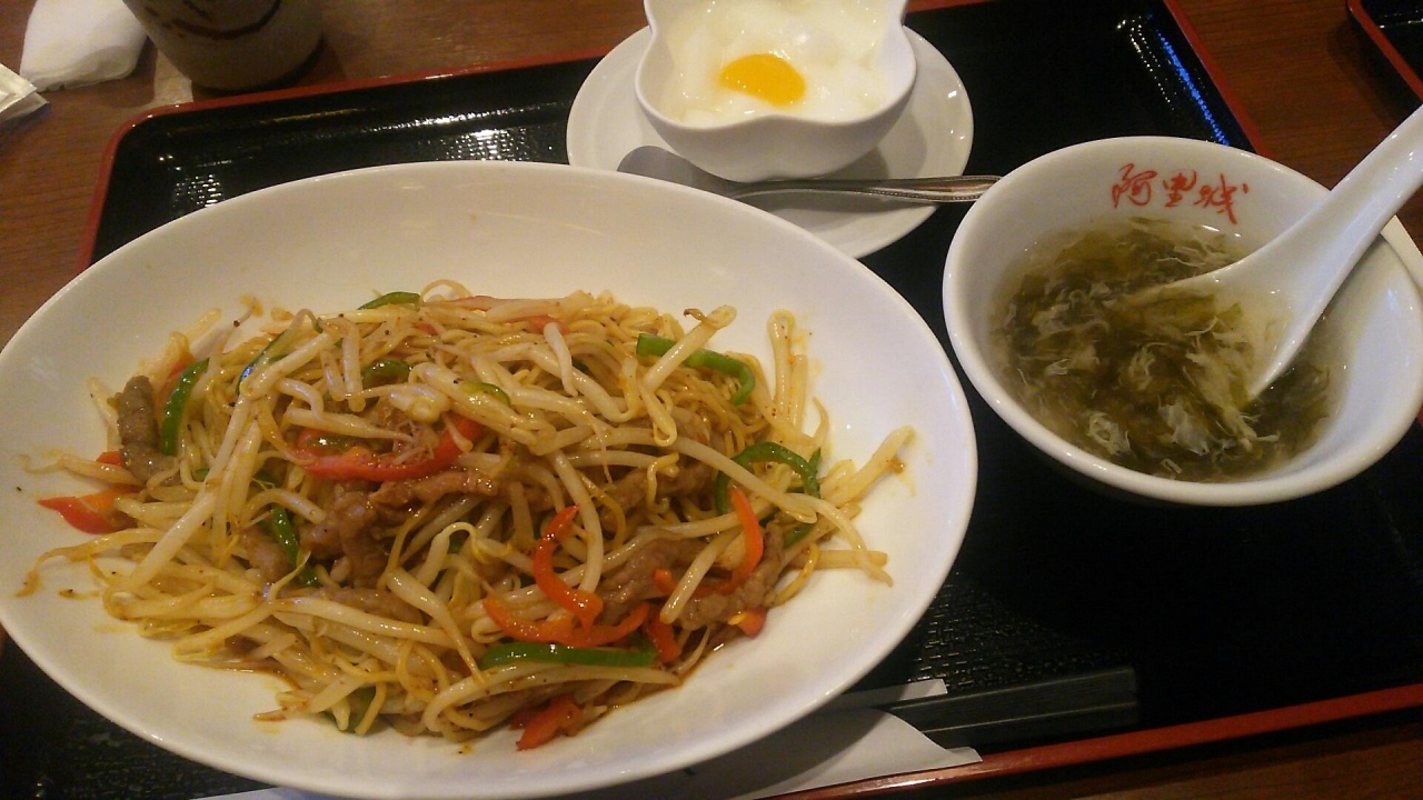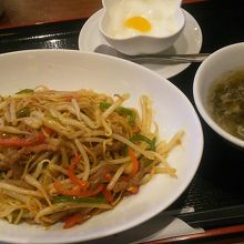 日替わりの定食もありましたが、通常メニューの中からマーラーやきそばを選択しました。麺は細め、マーラーがピリッと辛く美味しかったです。一口ですが、デザートが付いているのも嬉しかったです。