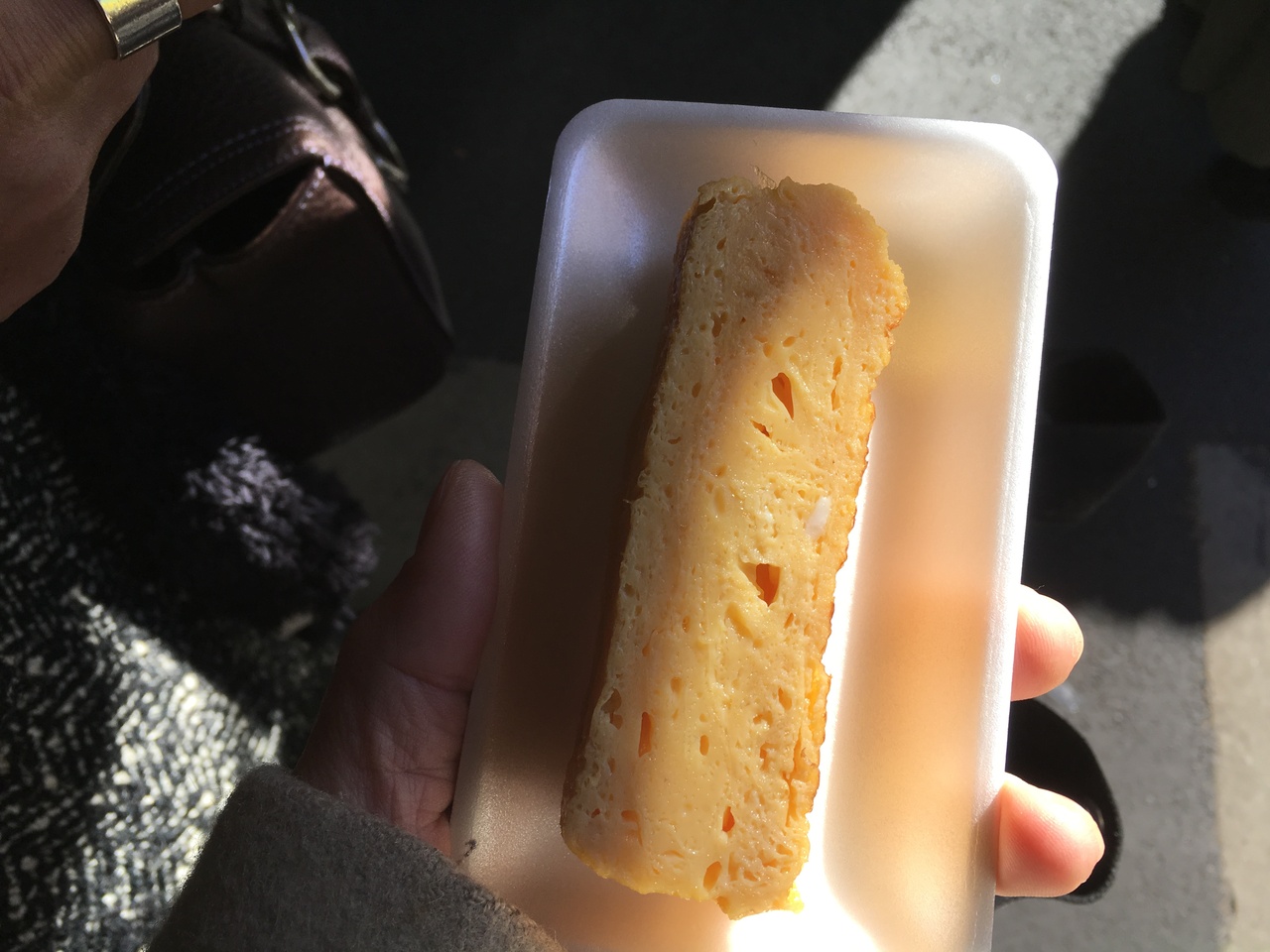 築地市場に入ったらほとんどの人が食べてるほど人気の卵焼き店です。ひとカット200円で確かにお味は美味しかったです。甘く味付けされていて何個でも食べられそうでしたが、お寿司を食べる予定でしたのでお代わりはしませんでした。テリー伊藤さんの写真があるので目印です。