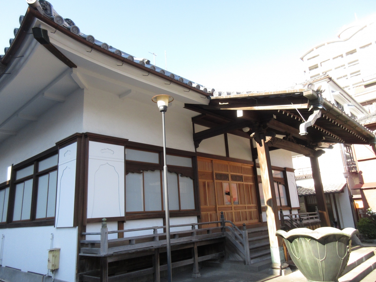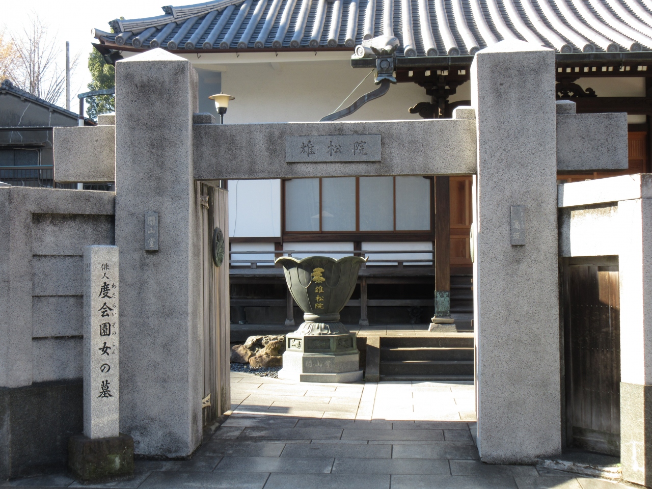 清澄庭園近くにある寺町に建つ、コンクリート製の重厚な山門が目を引く寺院です。墓地は広くありませんが、墓石が整然と並んでいます。境内には芭蕉の門人・度会園女の墓が立っています。山門前には彼女の経歴が刻まれた石柱が立っていますが、塀に近すぎているため一つの面の説明が大変読みにくくなっています。せっかくの説明文なのですから、なぜ石柱を塀から離して立てなかったか不思議に感じました。