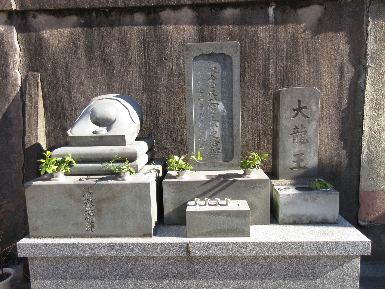 清澄通りを挟んで、清澄庭園の向かいに位置する寺町の一角に建つ雄松院の境内に立っています。芭蕉の門人として活躍する一方、江戸では富岡八幡宮門前に住み眼科医を営んでいた方だそうです。墓の隣には不思議な形をしたオブジェのようなものが置かれていました。目を表現したものかなとも思いましたが、なんだかわかりませんでした。桜を愛した方でもあり、富岡八幡宮に36本の桜の木を奉納したそうですが、戦災ですべて焼けてしまったそうです。今残っていれば立派な桜に成長していたことでしょう。