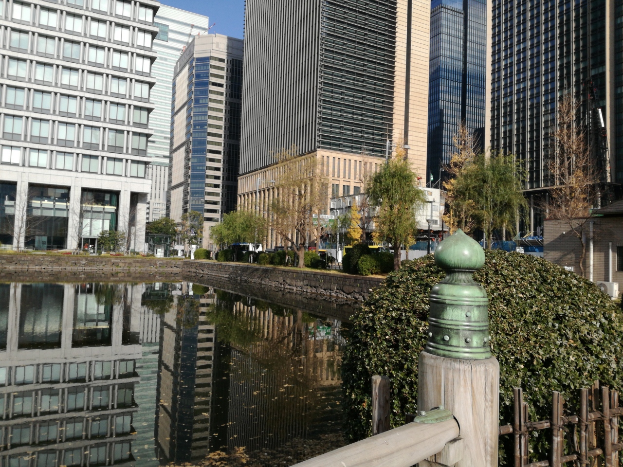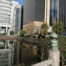 都営三田線の大手町の駅を南側に出たらすぐ見えます。文字通り和田倉濠に架かる細い橋で、日比谷通りと和田倉噴水公園を結んでいます。ちょうど風もない日だったので「水面に移るビル群や木々の姿がとてもきれいでした。