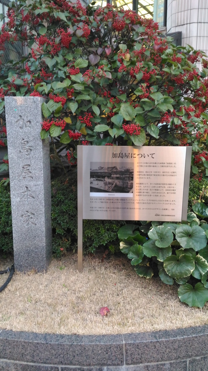 江戸時代に大阪で活躍した米問屋・為替商の加島屋の本家の記念碑です。大同生命大阪本社のすぐ横にありました。それもそのはずで、大同生命の源流だそうです。一般的には、NHKの朝ドラ「朝が来た」の舞台の家と言ったほうがわかりやすいかもです。