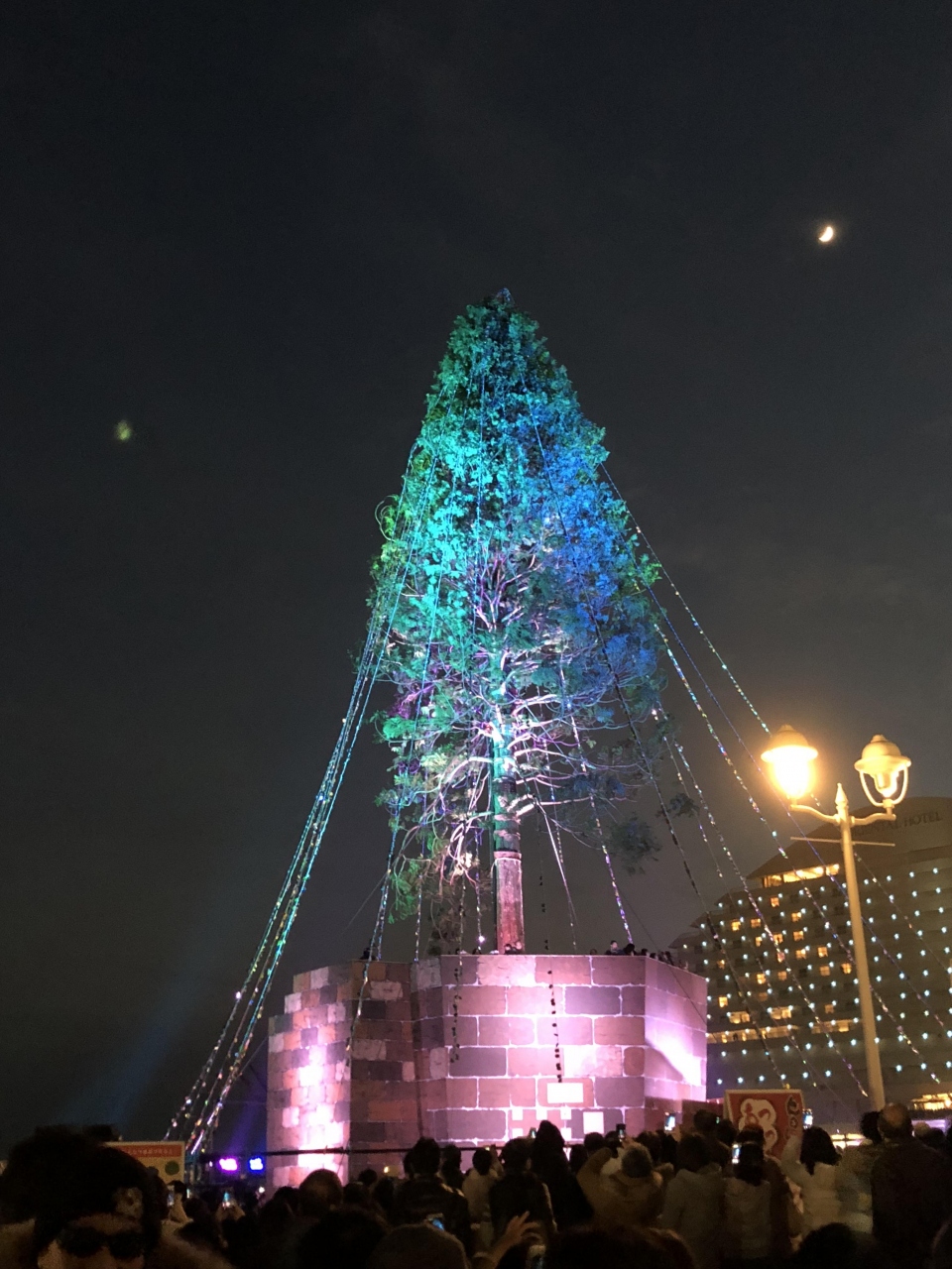 点灯時刻に音楽がかかり、様々な色のライトで彩られますがオーナメントが全くない為少し華やかさに欠けました。木も枝が垂れて元気が無さそうです。