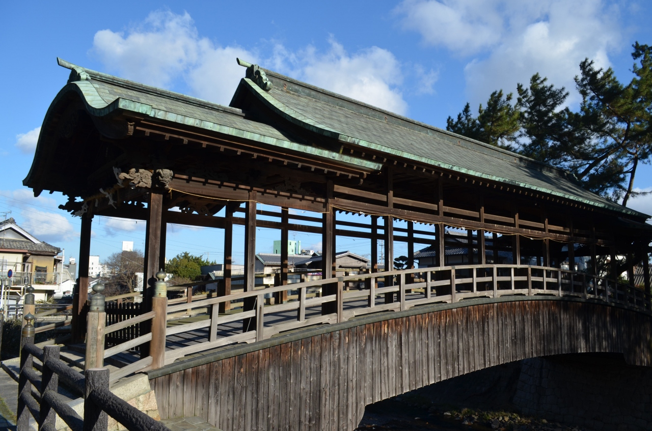 比羅さんの参道入り口から西に五分ほど歩きます。金倉川に架かる、屋根の付いた古風な橋です。神事に使われるのだそうで、普段は渡ることができません。しかしその姿は美しく、松を背景にしたところは創建当時の様子を想像して見惚れてしまいます。