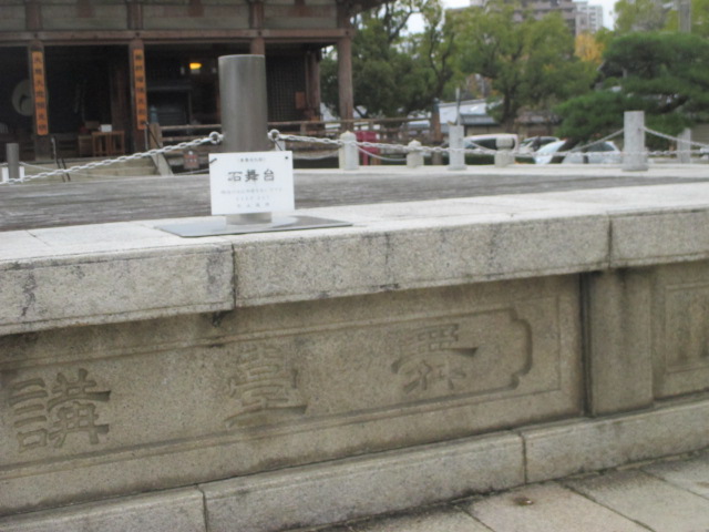 六時堂の前にある文字どおり石の舞台です。もちろん立ち入り禁止です。でもこの上に立って六時堂を眺めたいという衝動に駆られます。この両側に亀池があり、12月初めに行ったので、葉が赤く色づいていて、お花が咲いているみたいで綺麗でした。