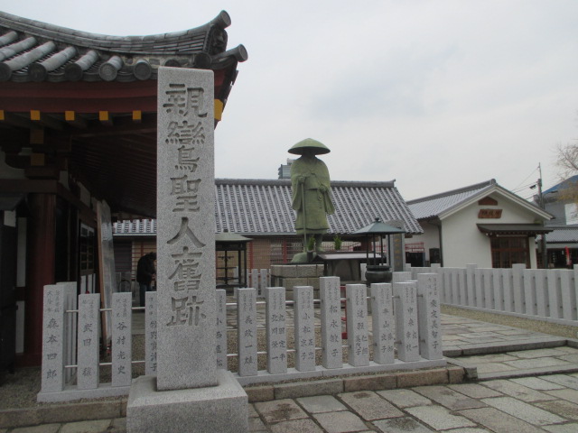 「親鸞聖人奮跡」と大きな石碑に大きな文字で書いてあるので、すぐにわかります。丸傘をかぶり、杖を突いてお経をあげているんだろうなあという像です。表情は若干見づらいですが、四天王寺さんで一番大きな像で、是非お参りしてください。