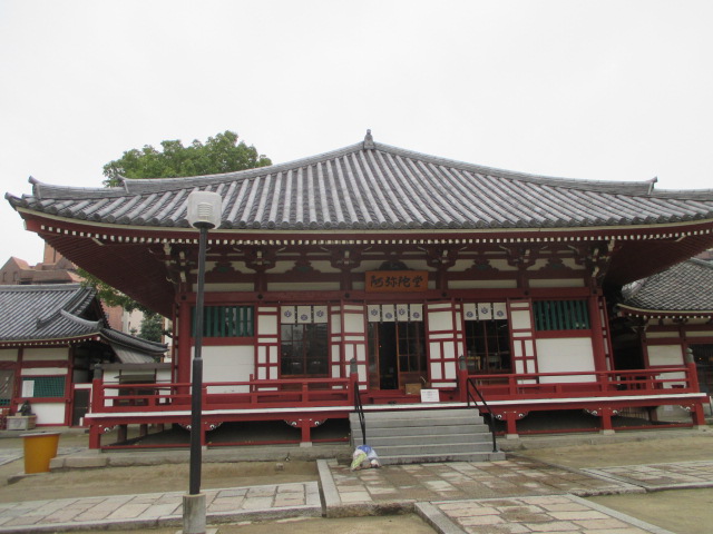 この建物も、黒・赤紫・緑と四天王寺さんの3大カラーからなる建物です。まず大きな屋根の黒瓦に赤紫の骨組み。そして他の建物は緑の欄干なのですが、この阿弥陀堂は緑の窓枠がワンポイントで入ってます。いかにも四天王寺さんの建物です。