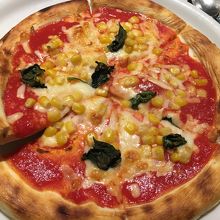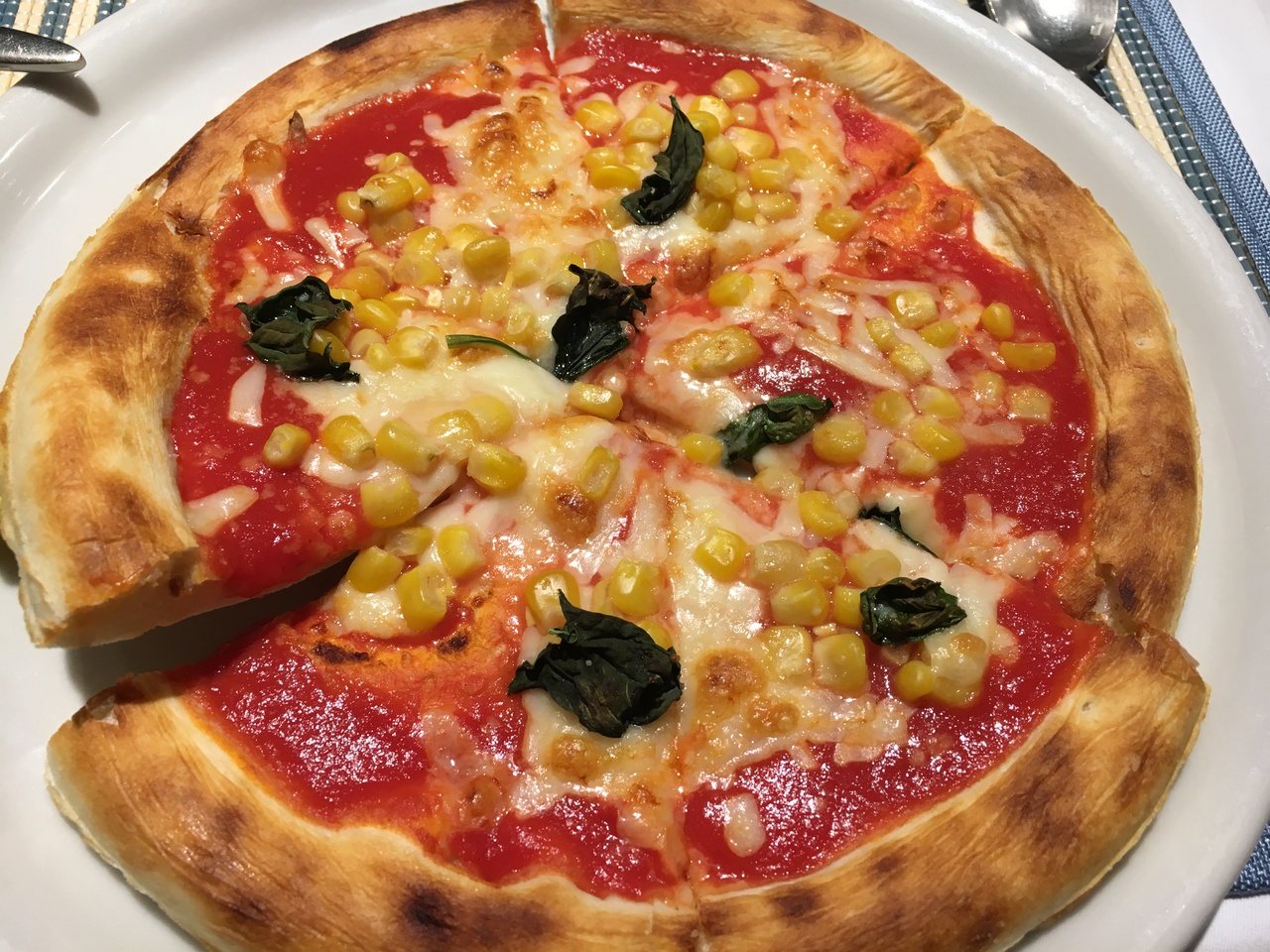 釜焼きピザが美味しいと聞き、ランチに行きました。ランチAセットは1000円でピザかパスタか選べて種類も豊富です。マルゲリータとコーンのピザにしました。切り分け用ナイフがついていてちゃんとカットされてました。サラダにパンがついていて飲み物はカフェラテも選べます。お腹いっぱいになりました。