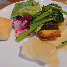 私はお魚、友人は合鴨を選びました。魚は真鯛で皮までぱりぱりに焼いてあり食べやすかったです。ソースは酸味が少々強く好みではありませんでした
