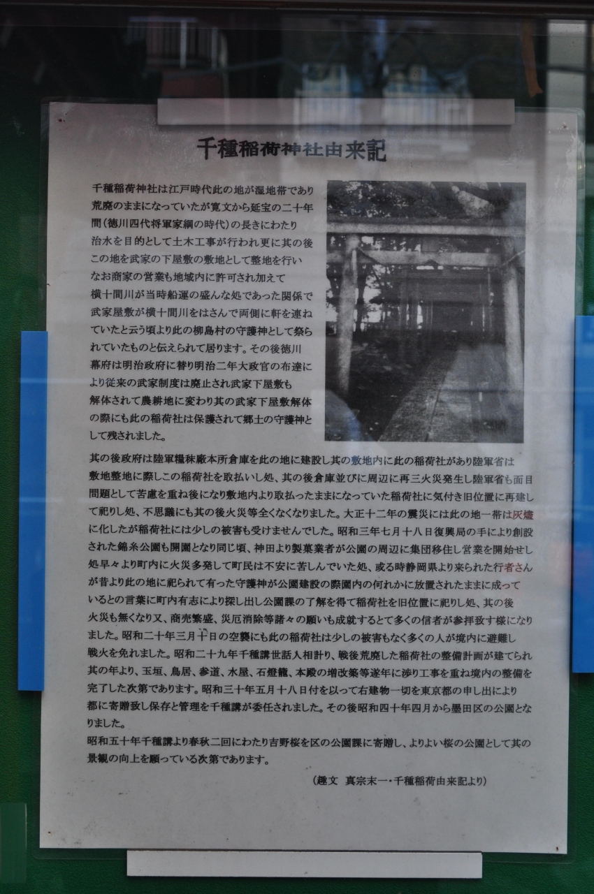 JR錦糸町駅から徒歩5分ほど、錦糸公園の南西側に位置する小さな稲荷神社です。境内には「千種稲荷神社由来記」なるものがありましたが、それをみても創建などの情報は得られませんでしたが、関東大震災や東京大空襲の際にも、こちらの神社は被害を受けることなく無事であったそうです。錦糸公園にはたくさんの人がいましたが、こちらの神社には誰もおらず、静かに落ち着いて参拝が出来て良かったです。