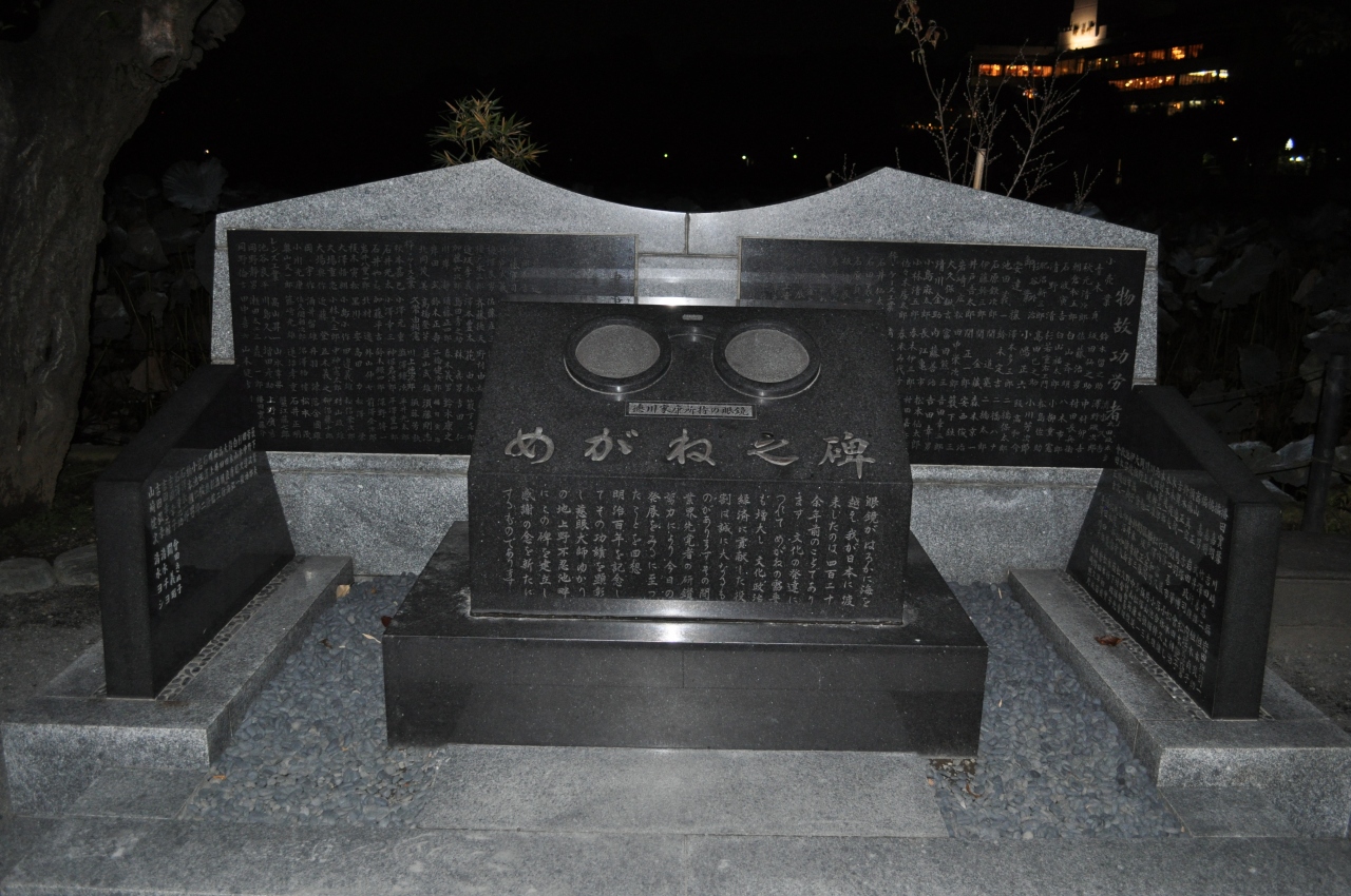 上野駅を降りて、上野恩賜公園を越えて不忍池に進むと、池のほとりにこの石碑はあります。不忍池にはいくつか面白い石碑がありますが、この石碑もなかなか面白いですね。石碑によると徳川家康公が付けていた眼鏡をかたどった者との事で、江戸時代にこんな近代的な形の眼鏡があったことにびっくりしました。でも江戸時代の肖像画などで眼鏡姿のものを見たことはないですよね。やはり高価なものだったのでしょうね。そういった時代背景にも思いをはせられて面白かったです。
