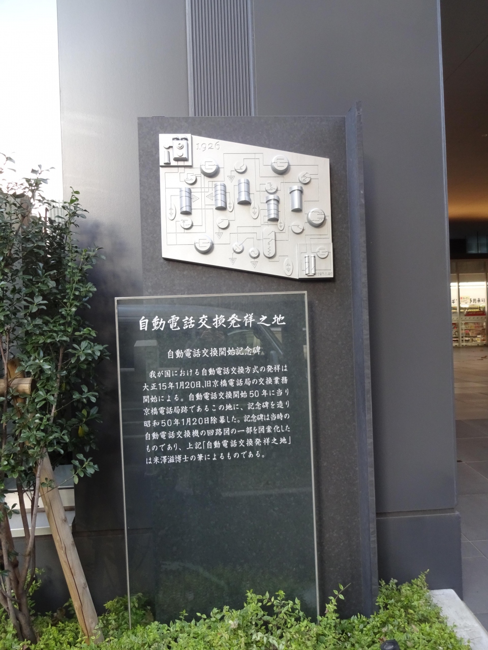 この場所はもと「京橋電話局」があったところで、大正15年に自動電話交換業務が開始され、その後五十周年を記念して、昭和50年に出来た碑のようです。
