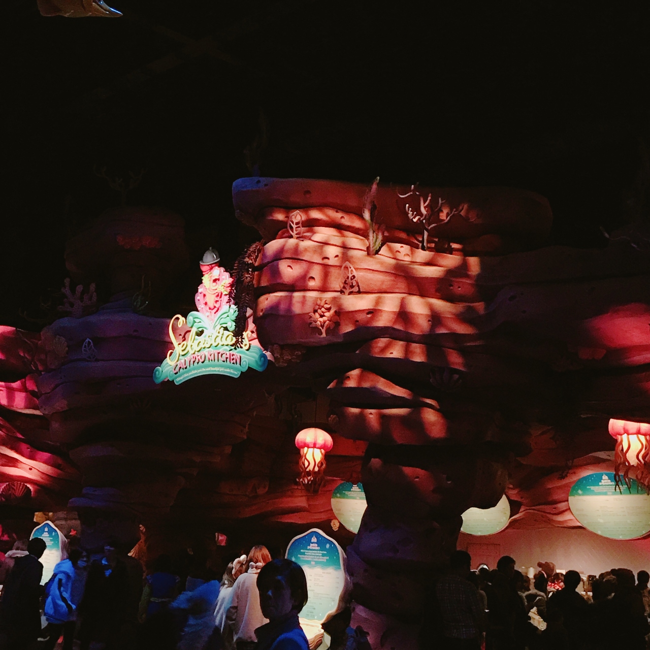 マーメイドラふーんにある海底のレストラン、セバスチャンのお気に入りの場所でもあります。カリブ海の島の伝統音楽を聴きながらサンドイッチなどのランチや軽ディナーを食べます。ただ照明が暗いので食べたら眠気が来ますね。