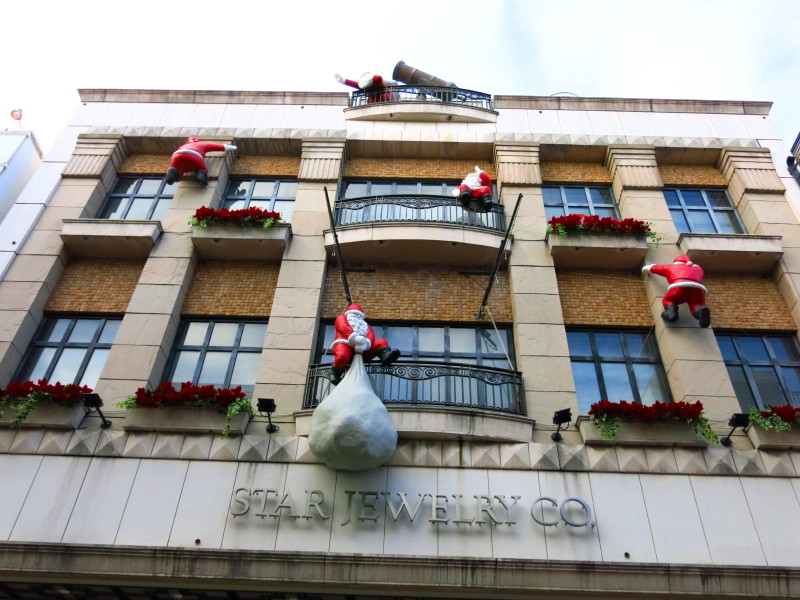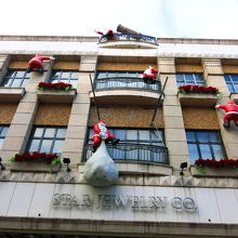クリスマスシーズンには沢山のサンタが壁をよじ登っています。これもお約束の一コマ。