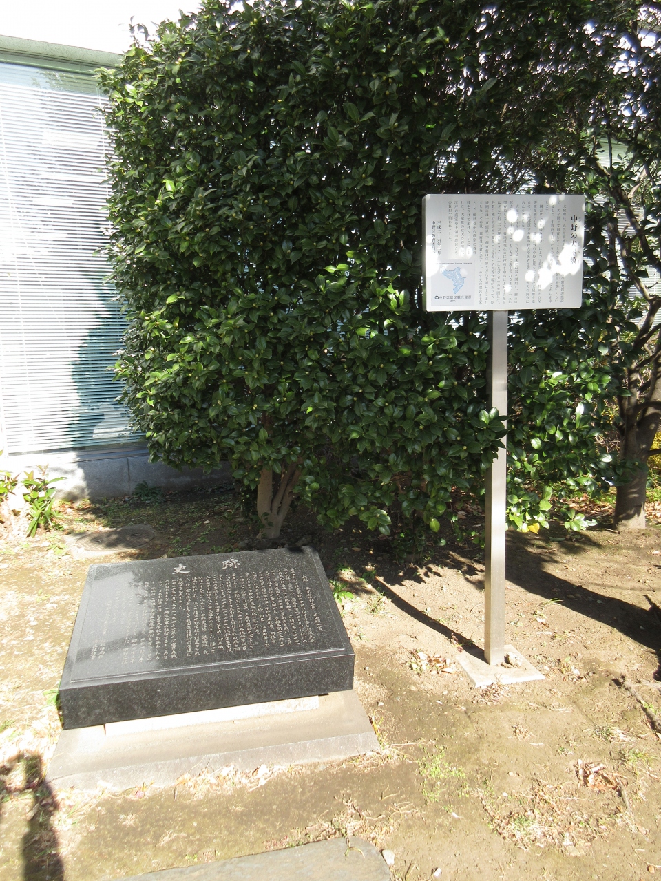中野区役所入り口右手に碑が置かれています。碑には1400年に鈴木九郎正蓮氏によって拓かれたこと、江戸時代には鷹狩の地として知られたこと、犬小屋がたくさん設けられたこと、桃園があったこと、明治時代には陸軍中野学校が設置されていたこと、戦後警察大学校が設立されたことなど中野区の歴史が刻まれています。植え込みの中に目立たないように置かれていること、刻まれた文字が読みにくいことなどから、目を向ける人はほとんど見られません。中野区の歴史を知ることができる貴重な碑であるにもかかわらず、注目されず残念に感じました。