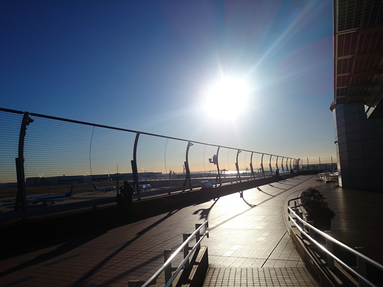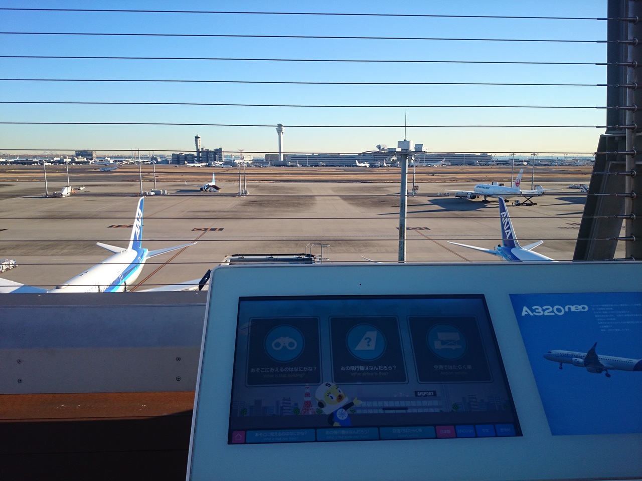 羽田空港国際旅客ターミナルの出発ゲート入口側の上にあがると外に出れて、空港の滑走路の景色が眺められる展望デッキがあります。