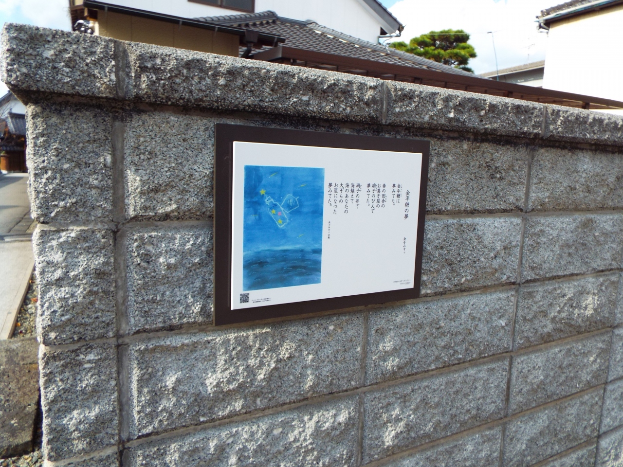 みすゞ通りの古い街並みの家々には、みすゞの詩をしたためた板が表札のように掛かっています。