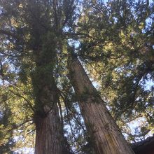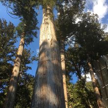 本殿裏の一本杉、本殿前には、夫婦杉、親子杉などもあります。
