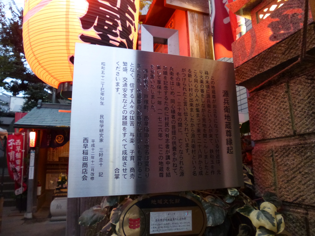 高田馬場駅から早稲田通りを早稲田大学の方へ向かって行った途中にあるお地蔵さんです。入り口のところに、案内板が立っていて、それによると、もともとは、荒れ地だったこの辺りを、源兵衛さんが開墾して、大きな村にしていったそうです。源兵衛さんを初め開墾により、村に貢献してぃとたちが祀られたそうです。そのためか、いつ行っても地元の方によって、きれいに管理されています。