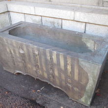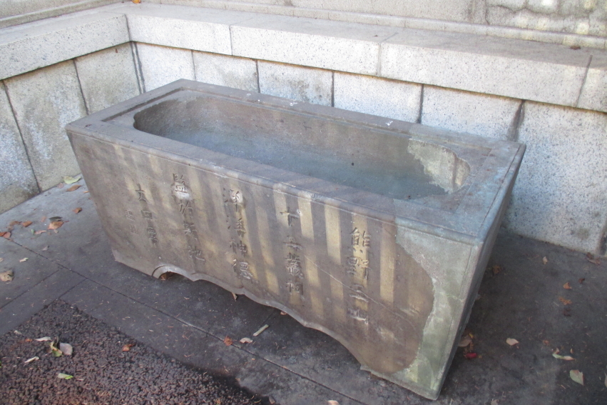 十二社熊野神社にある水鉢なので、手水舎に置かれているのかと思いましたが、もう現役ではなく本殿の右側の置かれていました。文政3年(1820年)に奉納されたものだそうです。長さが1m50cmくらいあって大きさも充分だし、まだまだ使えそうに見えますが、水漏れでもするのでしょうかね。