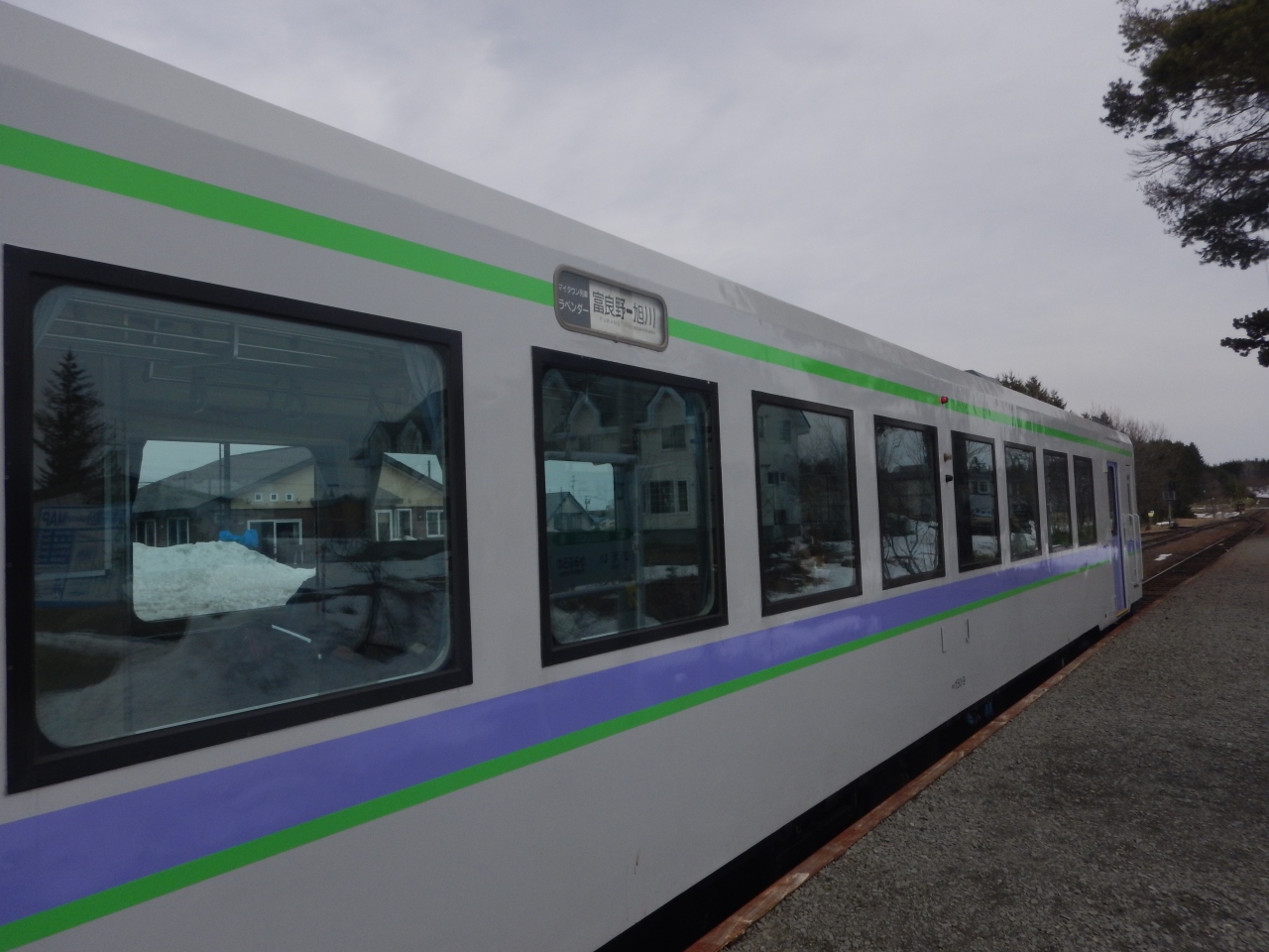 旭川から美瑛で途中下車して富良野まで乗ってみた。旭川~美瑛間はほぼ1時間に1本は列車がある。旭川発8:46.美瑛着9:23の美瑛行きに乗る。美瑛で50分ほど後続の富良野行きの列車を待つ。待っている間に美瑛駅付近を散策する。美瑛発10:14、富良野着10:57。夏場だと観光客が多いのだろうけど、4月はそれほど多くなかった。