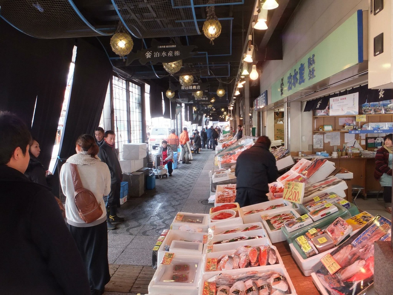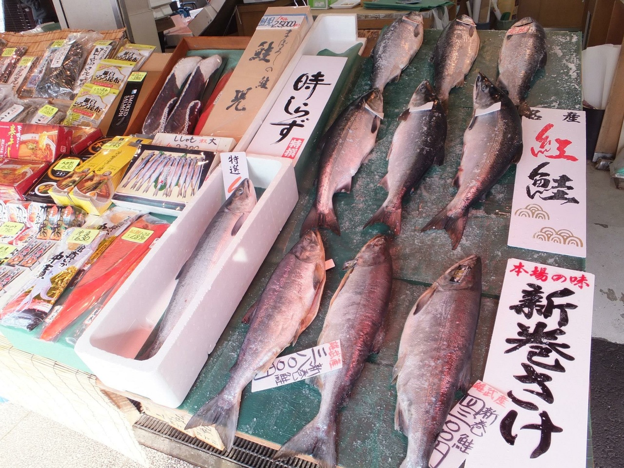 冬に訪れたので、蟹や鮭が中心に売られていました。