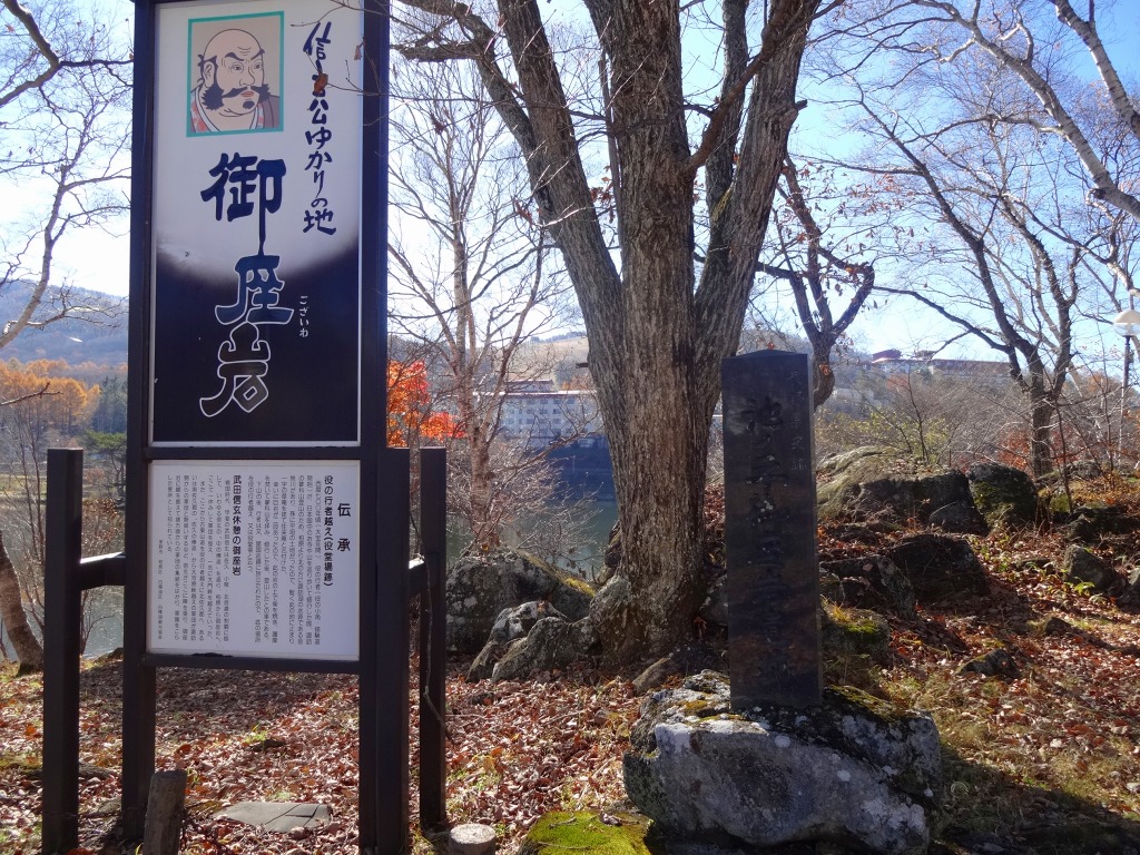 さて、湖畔には歴史的なスポットもありますが、武田信玄の「御座岩」もそのひとつ。