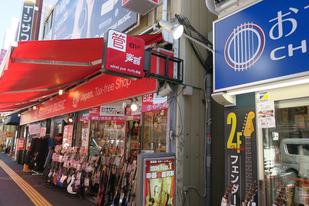 御茶ノ水駅から明治大学の方へ歩いて行く途中が楽器店街になっていて,道の両側に楽器店が並んでいます.