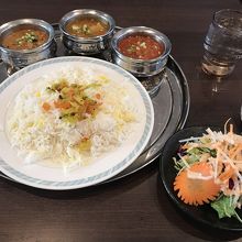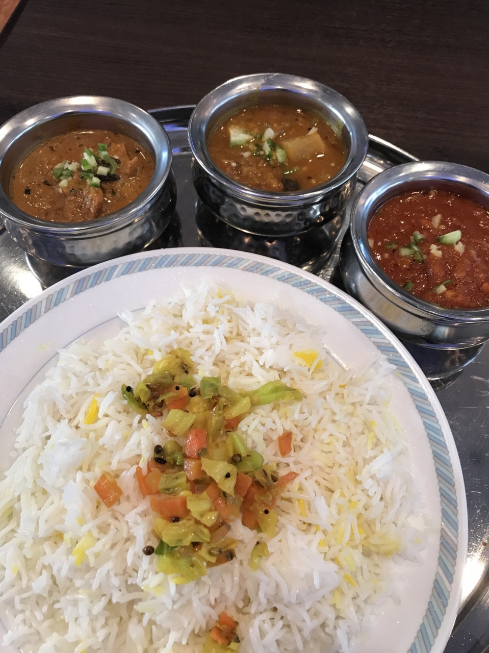 平日ランチはBiriyani lunch(ビリヤニランチ/カレーソースと米を重ねてかき混ぜたピラフのようなもの)と3種のカレーセットがおすすめだそうで、今回は3種のカレーを注文。ナンまたはライスを選択。ライスはサフランパスティカ米を使用とのこと。タイ米よりも長粒でパサパサしているが、カレーによく合う。ちなみにナンもライスもお代わり自由。