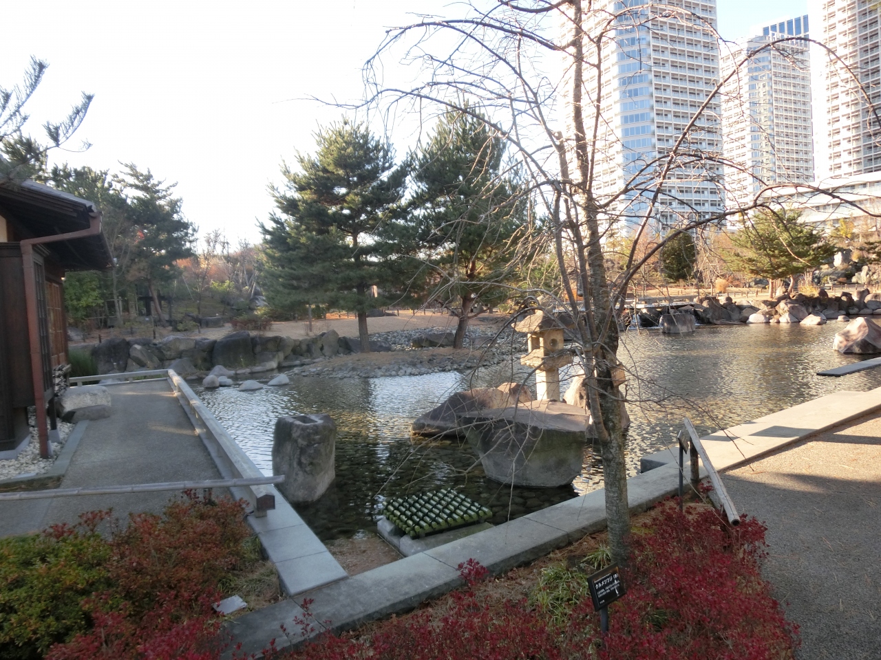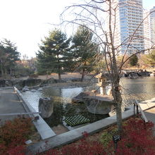 茶室風の建物の脇から庭園に入ると見事な回遊式日本庭園が広がっている。