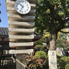浅草寺の宝蔵門から本堂へつながる通り沿いにある時計です。時計がついている塔は石でできているモニュメントでしたが、そこについている時計自体は普通の時計で、見やすかったです。それほど大きな時計塔ではありませんでした。