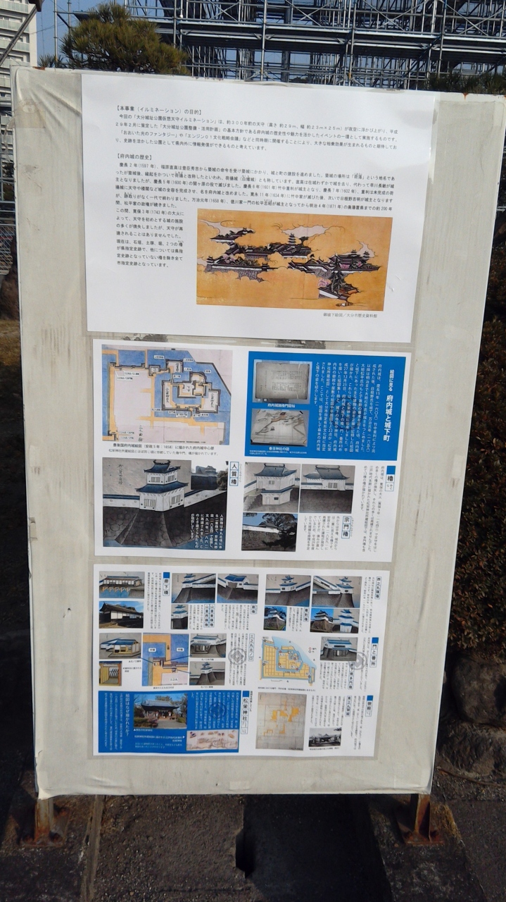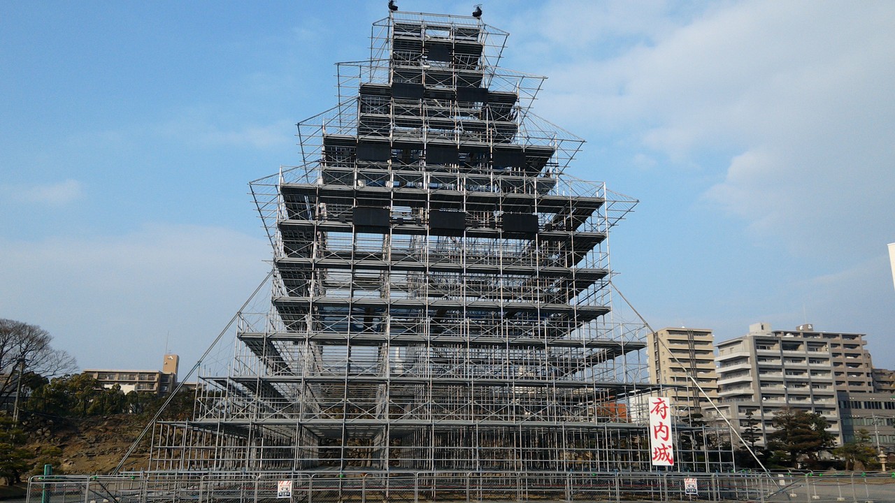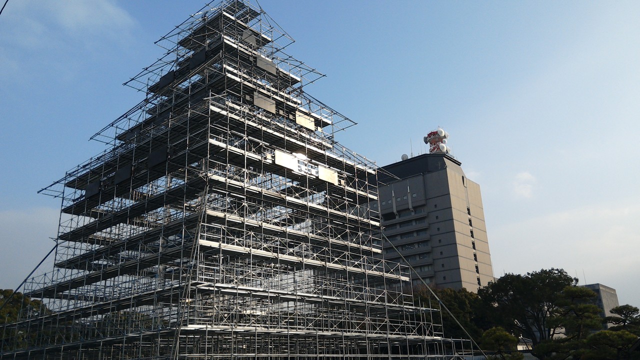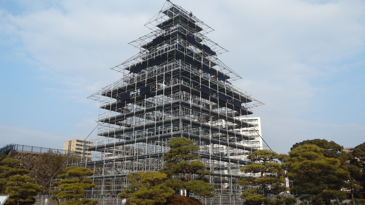 普段は何も無い広場に期間限定で30m近くある仮想の府内城の天守閣が設置されていて