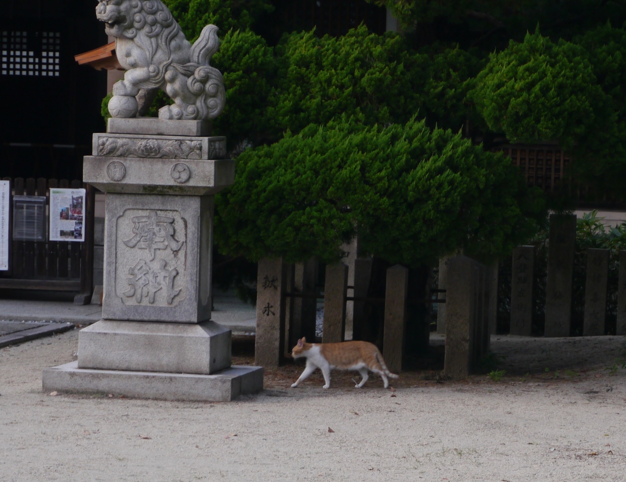 虎ではないのですが・・・境内で餌付けをしているらしく、地面に置かれた皿に向かって狛虎の下を一匹のネコがのっしのっしと歩いている姿が印象的でした。