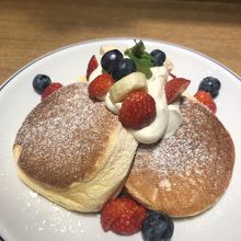 流行っているのに、パンケーキを食べるのが初めてだったので、ほかのお店との比較はできませんが、スフレのようなフワッフワな生地でほんのりとした甘さで、クリームをつけてちょうどよい感じでした。二人で一皿で十分でした。フワッフワだから、ナイフがないのかとは思うのですが、切るのには欲しいです。