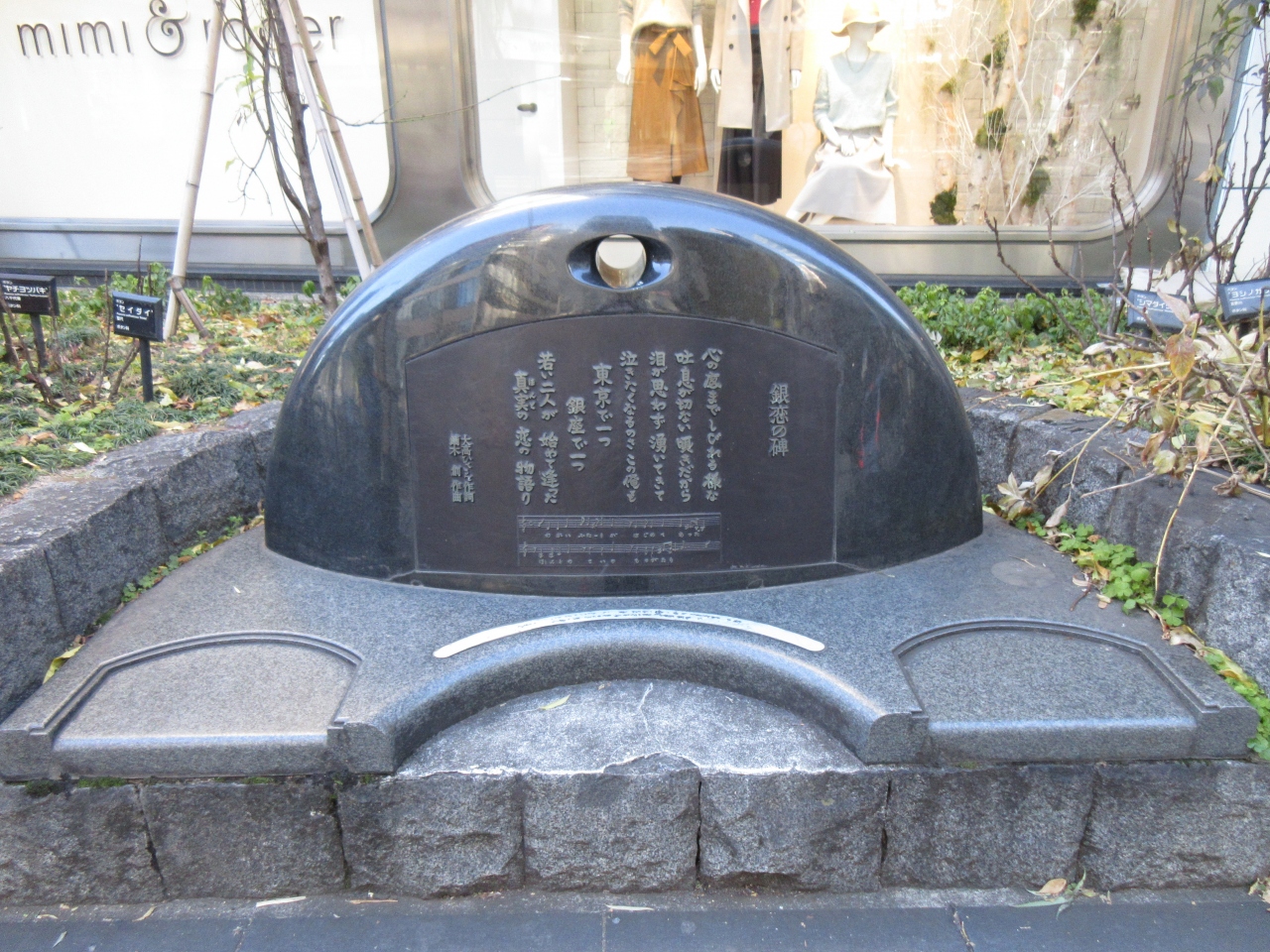 数寄屋橋交差点かど、宝くじ売り場側にある数寄屋橋公園の植え込みの中に置かれています。デュエットソングの名曲・銀座の恋の物語の歌詞とメロディが刻まれています。シニア世代にとっては若いころの思い出がよみがえる場所に置かれていると思います。つい口ずさみたくなる方もいるのではないでしょうか。