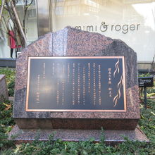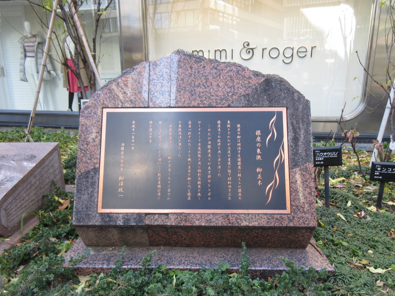 数寄屋橋交差点角にある、宝くじ売り場側の数寄屋橋公園の植え込みに、銀恋の碑と並んで建っています。明治時代に銀座の象徴として植えられていた柳が消滅、その後、碑の向かいを走る西銀座通りに柳が植えられたことを記念して碑が建てられました。年に1回、柳まつりが開かれたり、柳の木が年々立派になってきたり、銀座に柳のイメージが定着してきている気がしています。