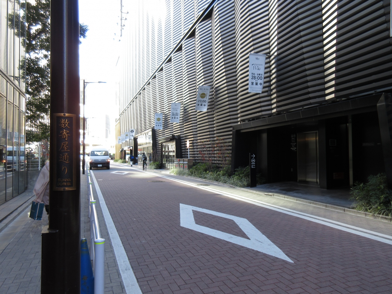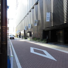 数寄屋橋交差点から東急プラザ裏を通る道路です。車道と歩道を石畳の色で分けています。車道がレンガ色、人が歩く部分はグレーになっていて、見た目で区分けされています。平日午前に訪れた時は歩行者も車も多くなかったです。広くない通りですが、危険に感じなかったです。賑やかな銀座にある静かな通りです。