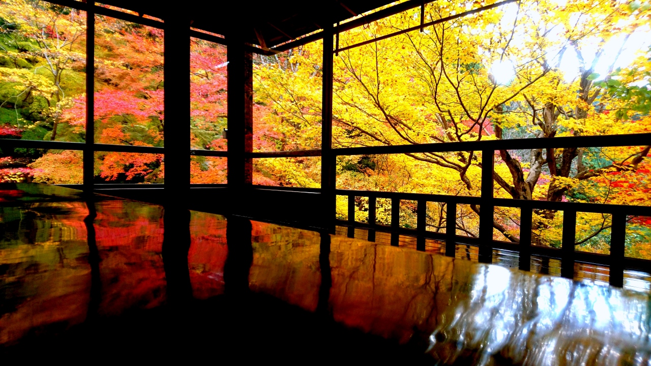 京都に紅葉狩りをしに瑠璃光院に行きました。紅葉シーズンだったため、瑠璃光院に入るには、まず整理券をもらい、集合時間に待ち合わせして入るというもので待つだけでも時間が掛かりました。中に入って書院2階から見る風景が実に素晴らしく印象的でした。ピカピカに磨かれた床や机に映り込んでより美しくなっていました。長時間待った甲斐がありました。