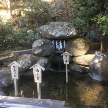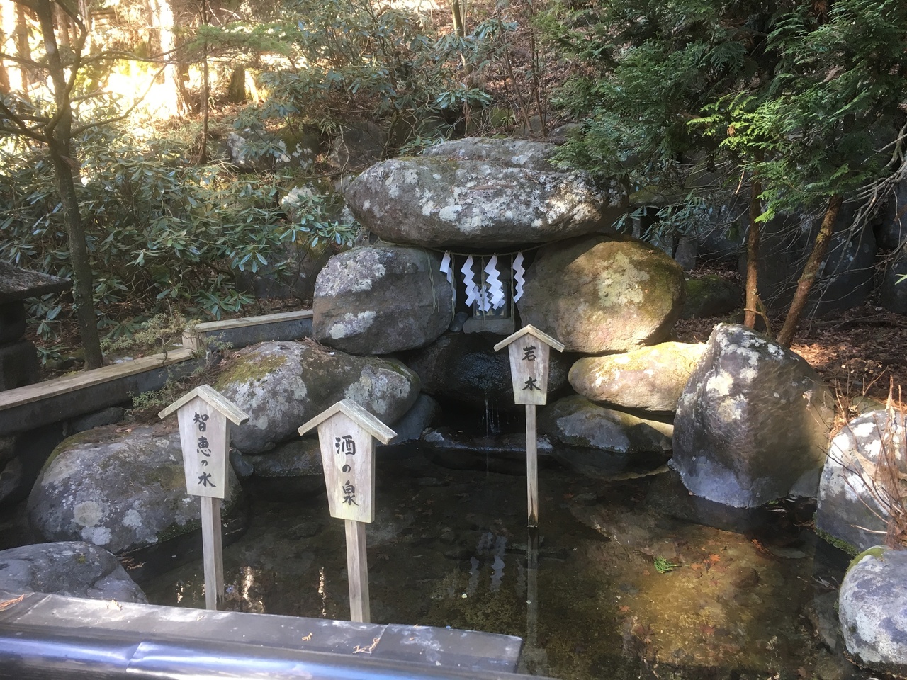 泉というか池のようになっており、智恵の水、若水、酒の泉といった立て札が立っています。