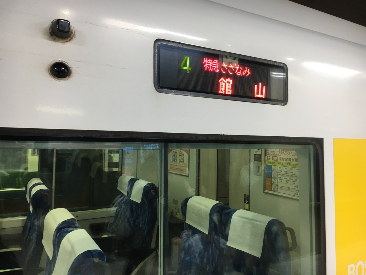 東京駅から特急さざなみに乗って年末に富浦に行きました。5両編成です。京葉線2番ホームから発車します。12/31久しぶりの雪でした。蘇我までは外房線と一緒でその後分かれます。80%ぐらい席が埋まってました。