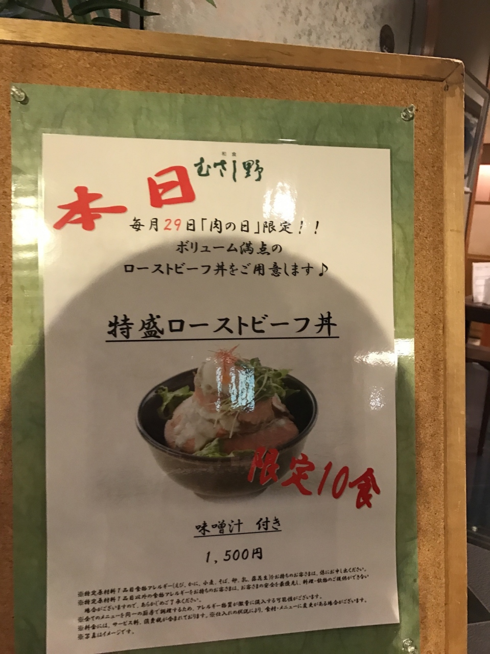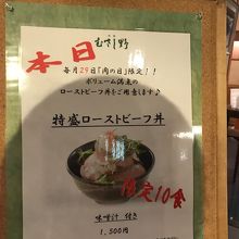 毎月肉の日(月により変更あり)に食べることが出来る特盛ローストビーフ丼です。普段は限定20食ですが、この日は10食だったので予約をして行きました。
