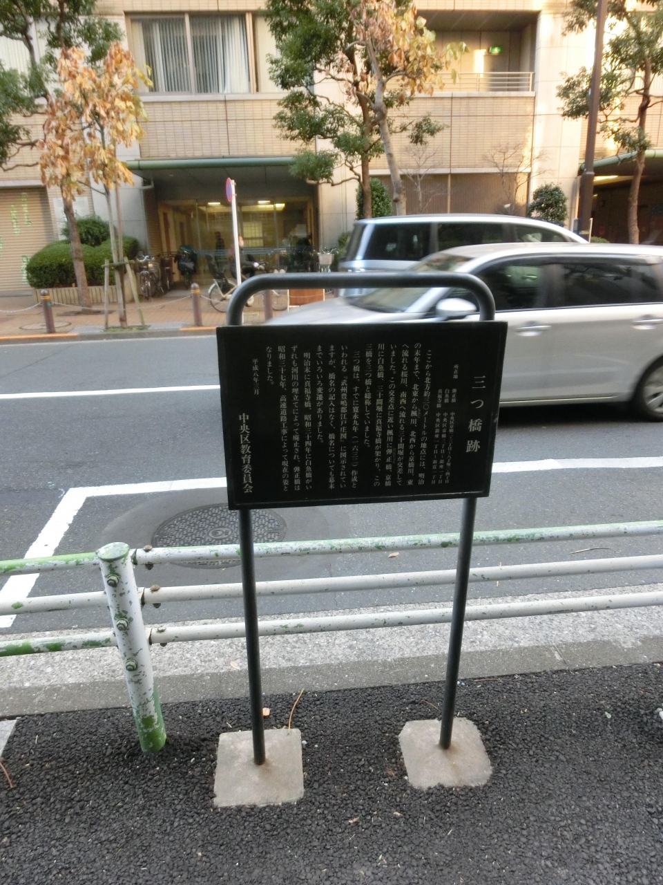 楓川、京橋川、桜川、三十間堀が交差し、楓川には弾正橋、京橋川に白魚橋、三十間堀に真福寺橋の三つの橋が架かっていた時代があった。