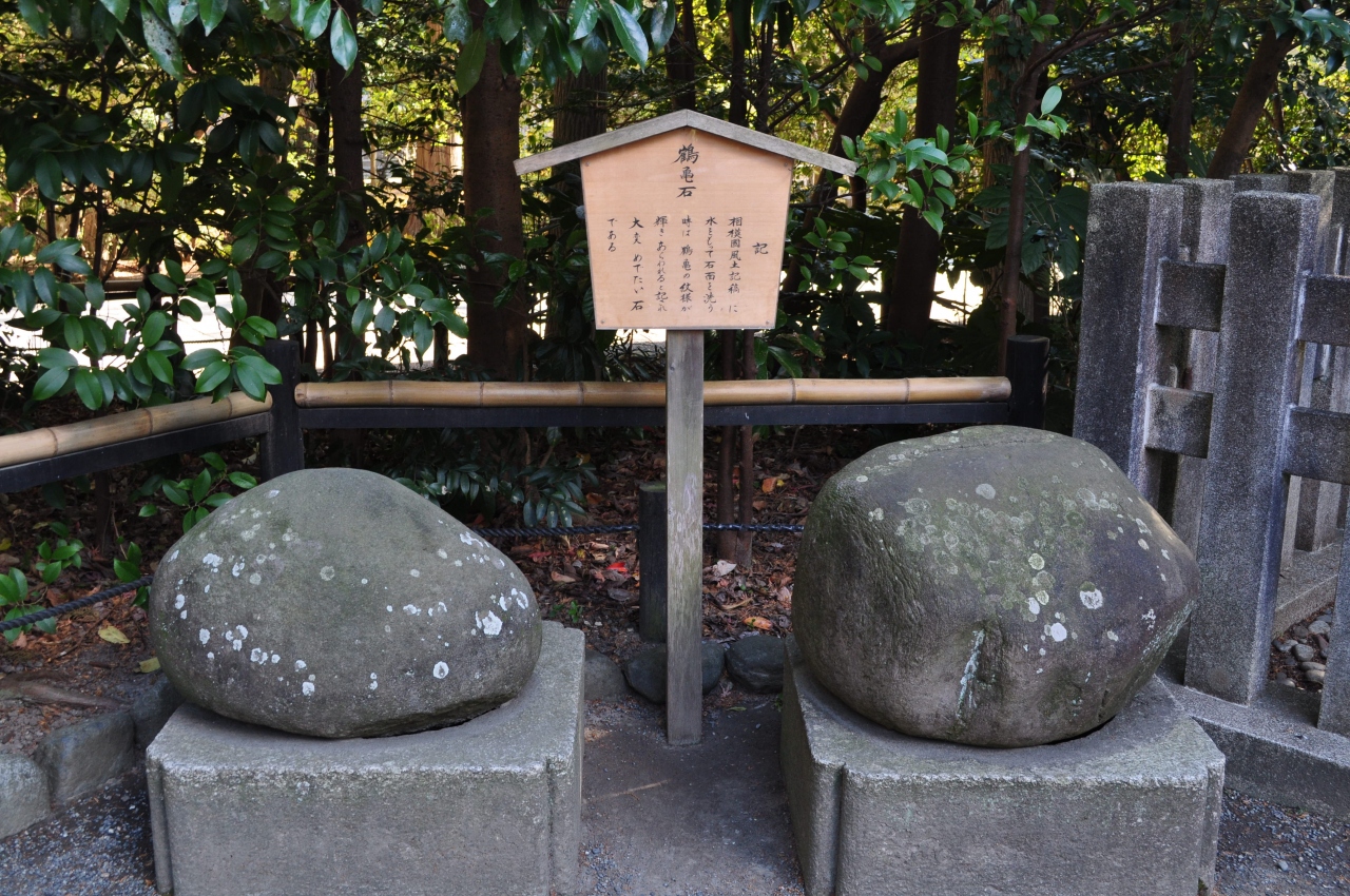 鶴亀石は鶴岡八幡宮の中の若宮と白幡神社の間くらいに置かれていました。石を見るだけではわからないのですが、そばの案内板によりますと、水で洗うと鶴と亀の模様が浮き出るようです。実際に水をかけていないのでわかりませんが、雨の日にくればわかるのでしょうか。ちょっと興味をそそられますね。雨の日に来た際には立ち寄りたいと思います。