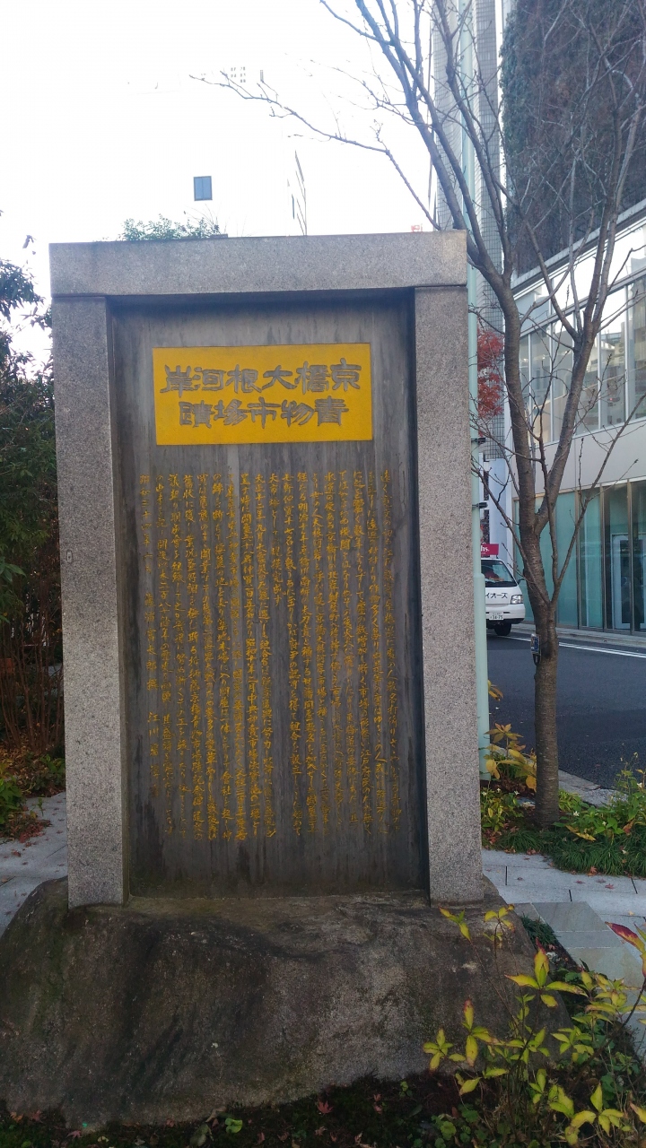京橋の記念碑からは高速道高架の反対、東京駅側に記念碑が建っていました。いまはもうありませんが、江戸時代にあった京橋川の水運を利用して野菜の売り場が設けられいたそうで、大根の入荷が多かったために「京橋大根河岸市場」と呼ばれていたそうですが、1935年に築地へと合併、移転してしまったそうです。