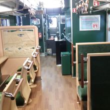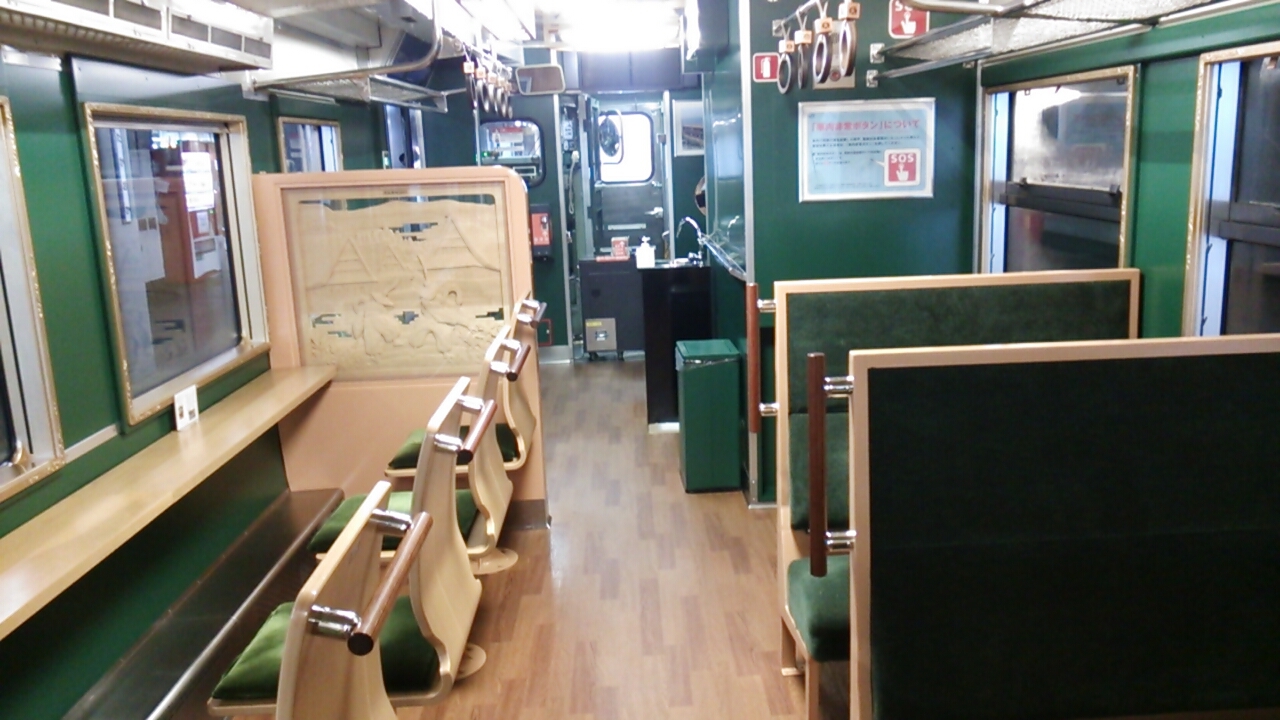 キハ40系という国鉄製の車両が使用され、緑に統一された内装となっていました。座席は海側の席は進行方向が海側となっているベンチシート、山側の席は4人掛けのボックスシートとなっていました。