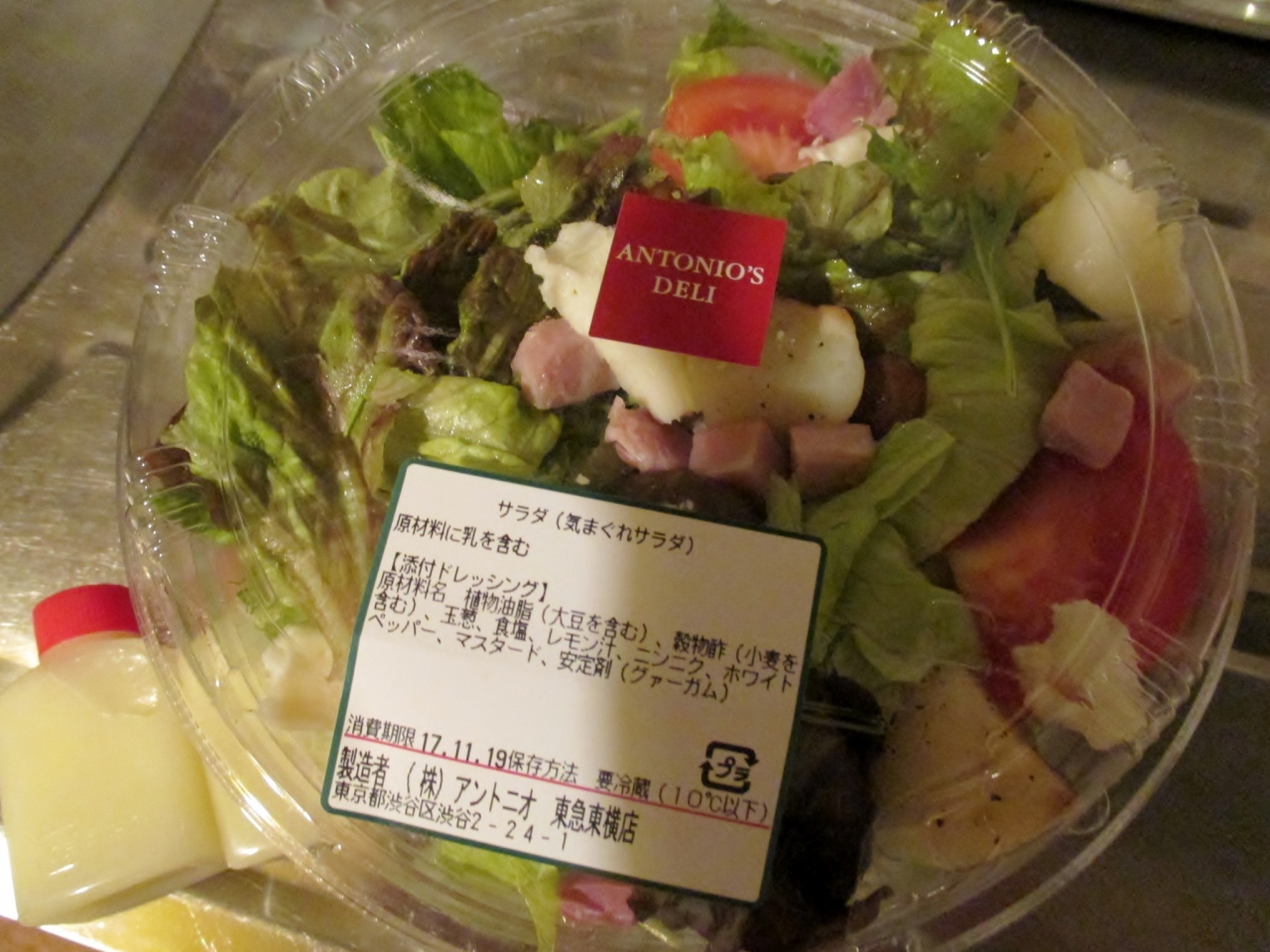 今回は「気まぐれサラダ」を購入。彩りがきれいです。甘栗、モッツァレラチーズ、ハムなどが散りばめてあって、とてもオシャレでした。手作り風のどろっとしたドレッシングも、レストランの味で美味しかったです。