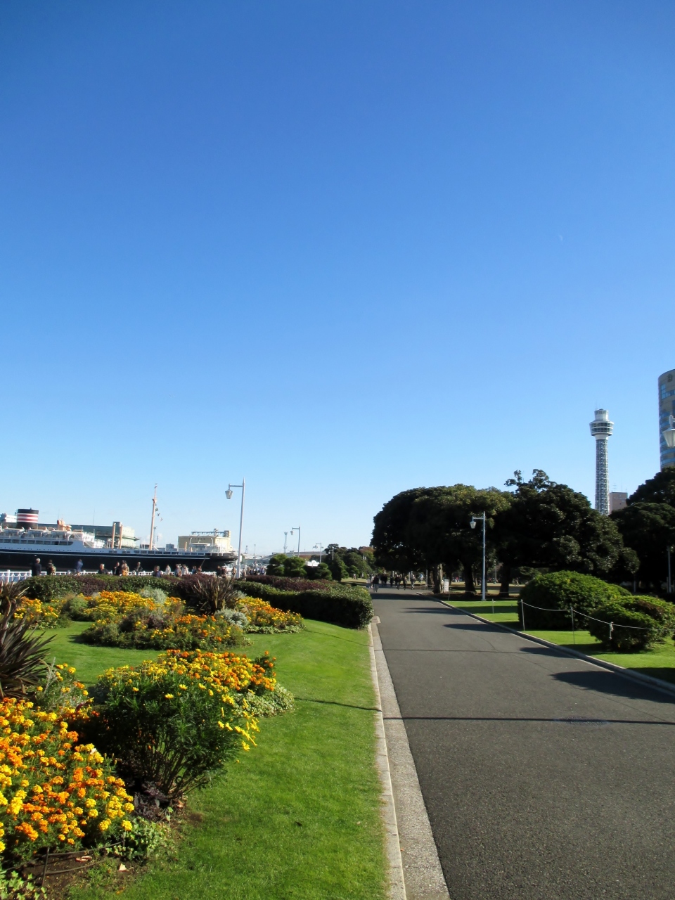青い空に青い海、きれいな配色の氷川丸、緑と花がたくさんで、とても景色が美しい公園でした。