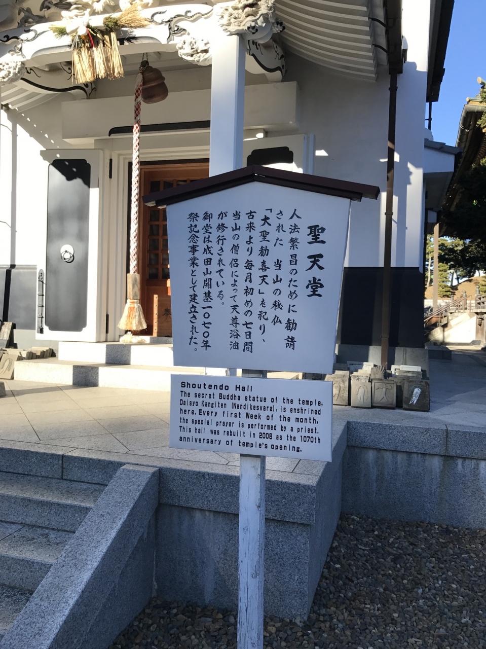 成田山新勝寺にある聖天堂であります。繁栄のために勧請された秘仏を祀っております。毎月、一日から七日間は成田山新勝寺の僧侶により天尊浴油が修行されています。御堂は成田山が開基して1070年祭記念事業として造られました。