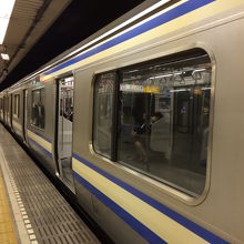 成田空港行きの総武線の快速電車で、東京駅からぐっと海岸沿いに千葉駅をまわるので、京成の特急よりも料金も高く、時間もかかります。真ん中にあるグリーン車(要別料金)と、車両の端1両は遠距離電車用のボックスタイプのシートになっています。が、外国人やジャパンレールパスを使えるには魅力の電車です。今度のダイヤ改正からこの名称は使われなくなるそうですが、この電車はそのまま走り続けるそう。